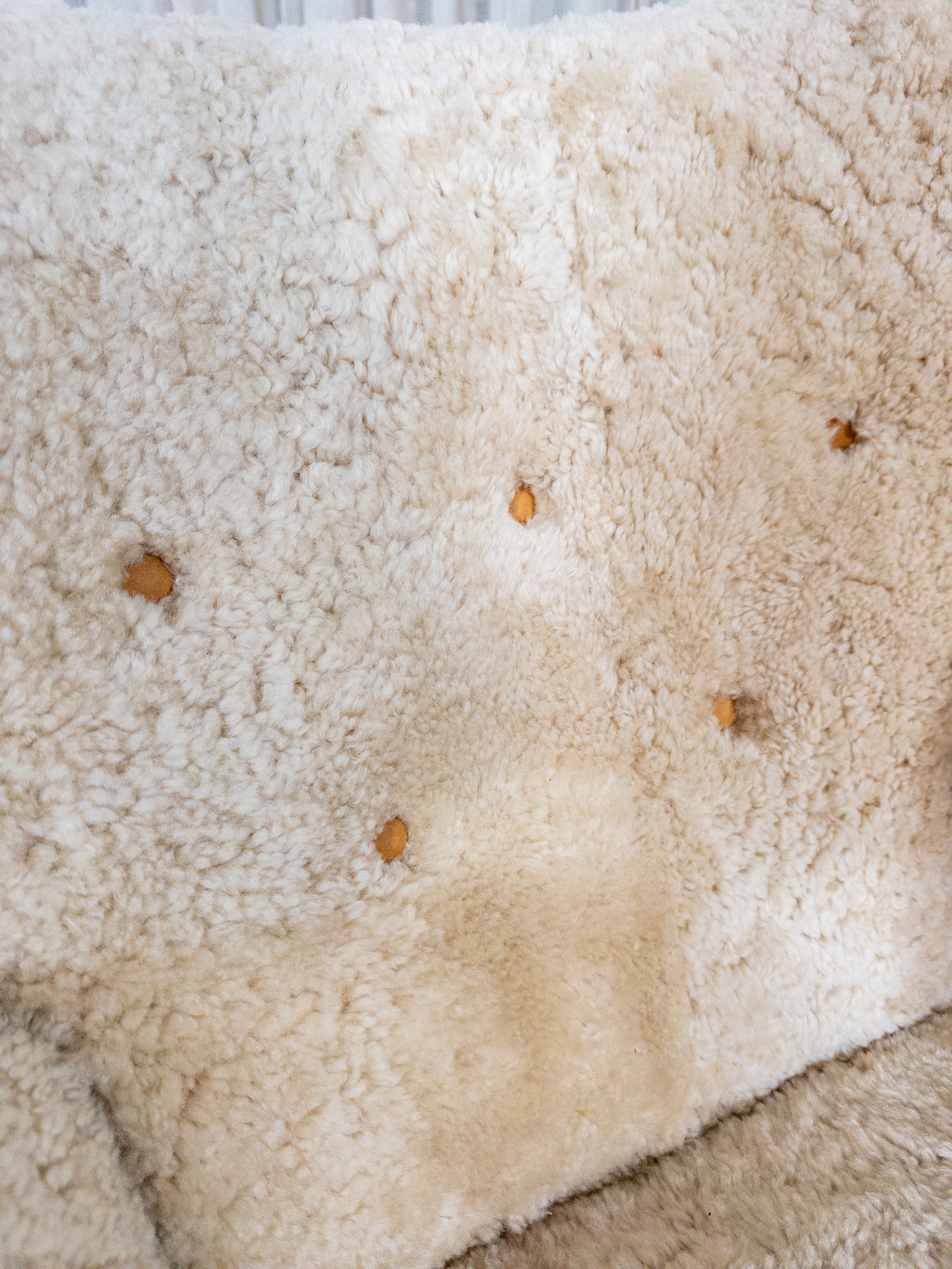 Vackra detaljer i trä längs armstöden samt knappar i cognacsfärgat skinn ger en elegant kontrast till det ljusa fåret och förstärker det exklusiva helhetsintrycket.