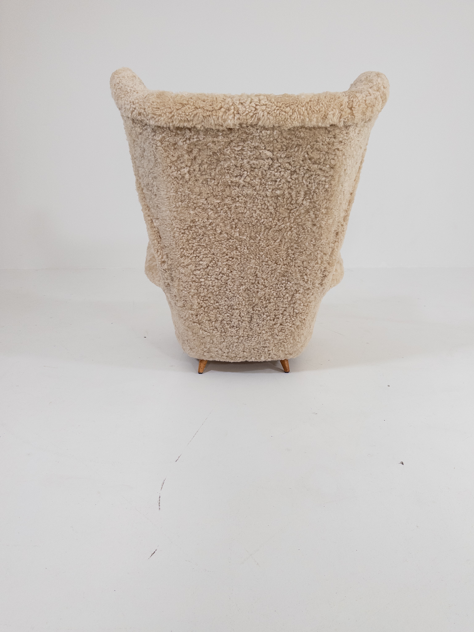 Fantastisk öronlappsfåtölj i äkta fårskinn, ett uttrycksfullt exemplar från den svenska Swedish Modern-eran under 1940-talet.