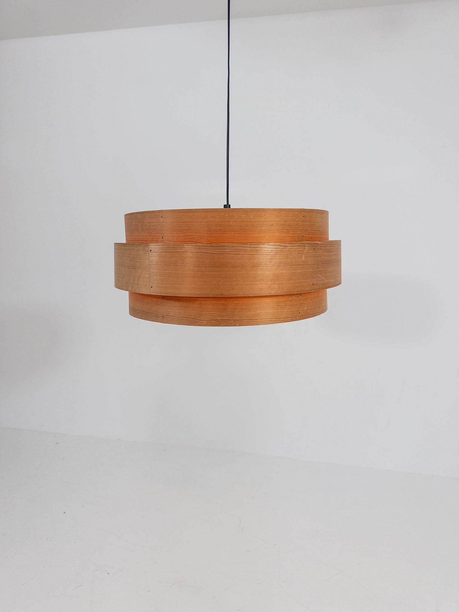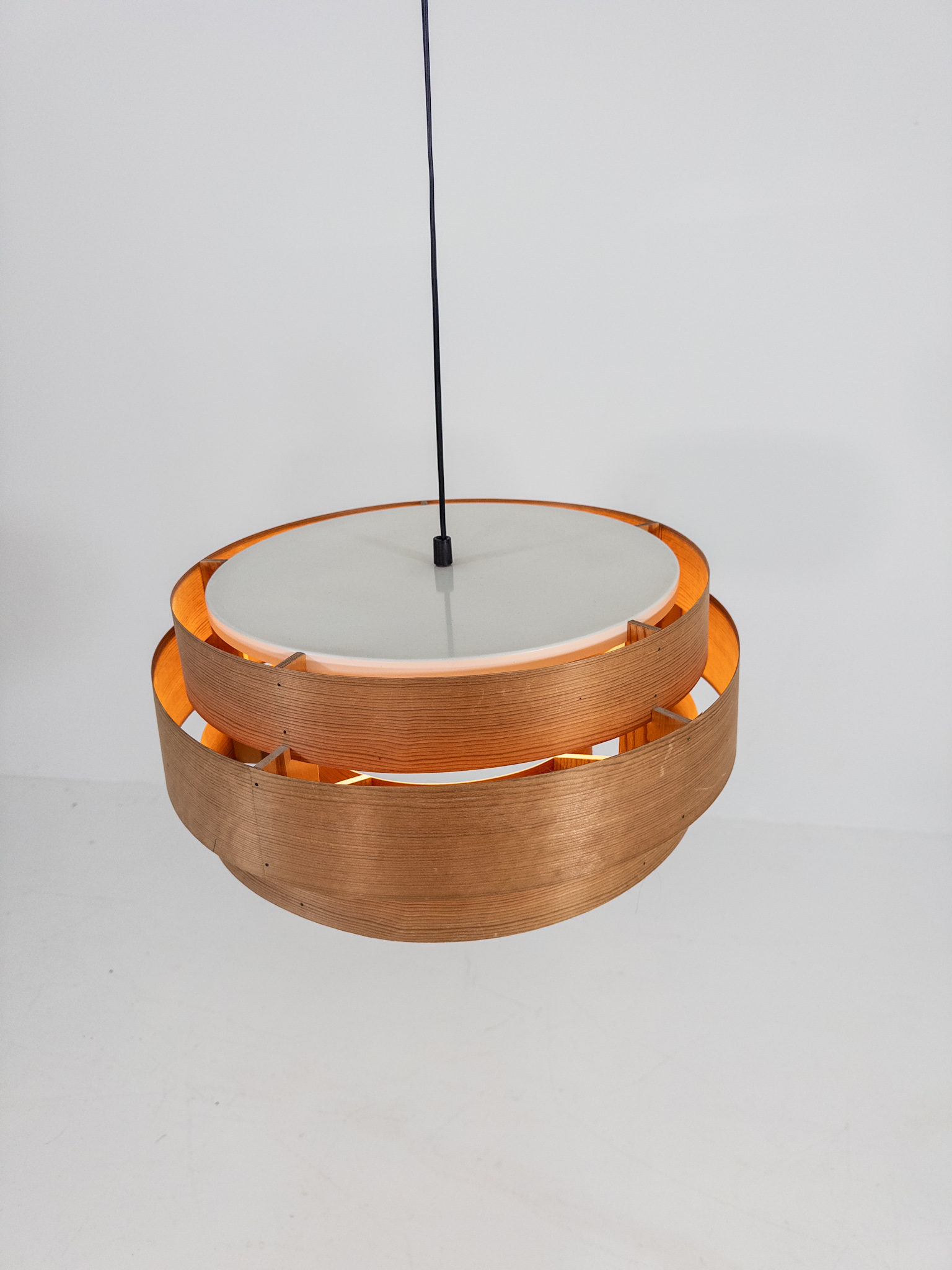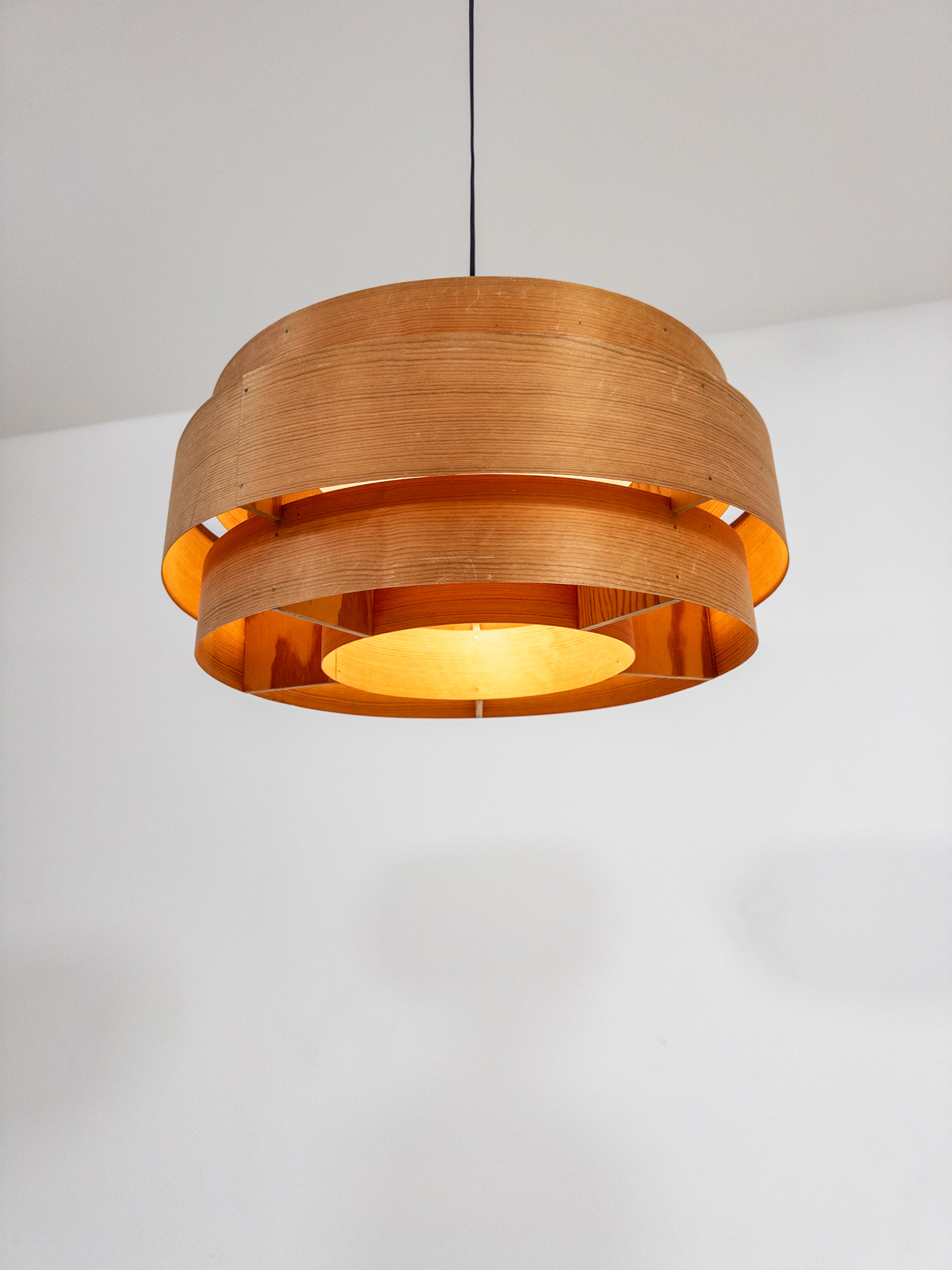 Vacker taklampa från 1960-talet, formgiven av Hans-Agne Jakobsson för Elysett Markaryd. Lampan är tillverkad i böjd spån med en varm, mjuk ton som ger ett stämningsfullt och behagligt ljus.