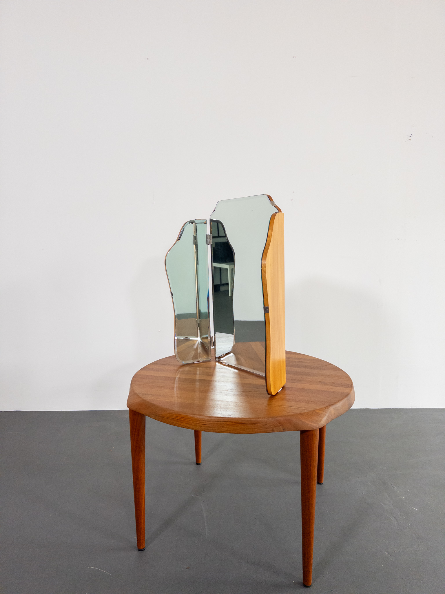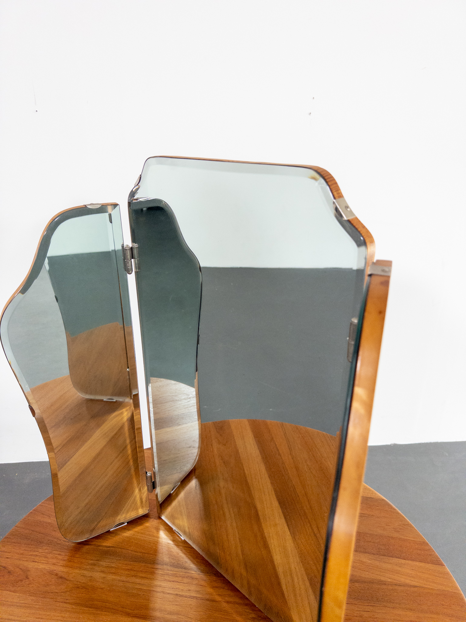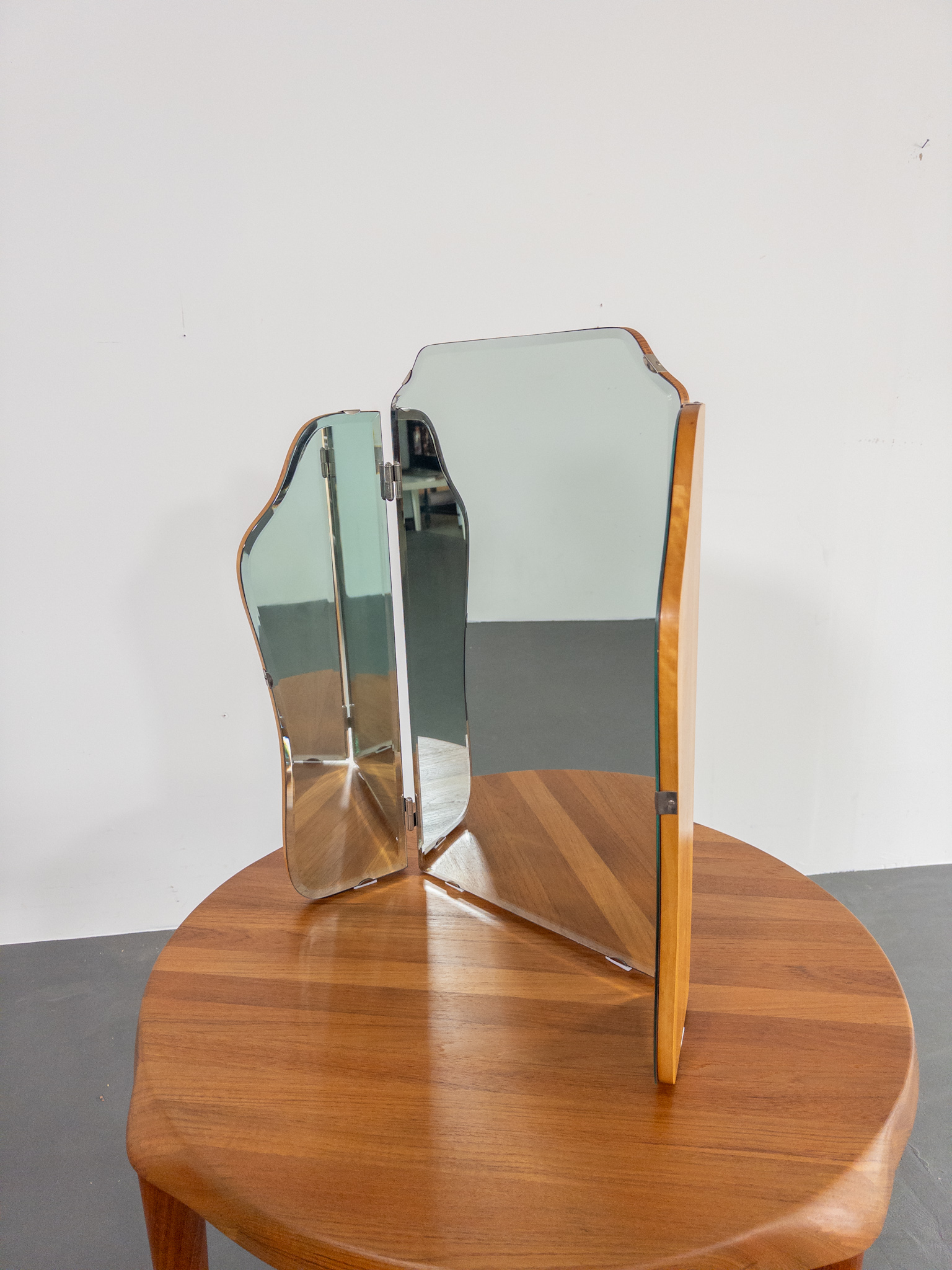 Elegant och tidstypisk tredelad spegel från 50-talet med böljande former och fasettslipade kanter. Denna vackra spegel är tillverkad av Johansfors Spegelfabrik i Broakulla och bär märkning på baksidan – ett autentiskt svenskt hantverk med historia.