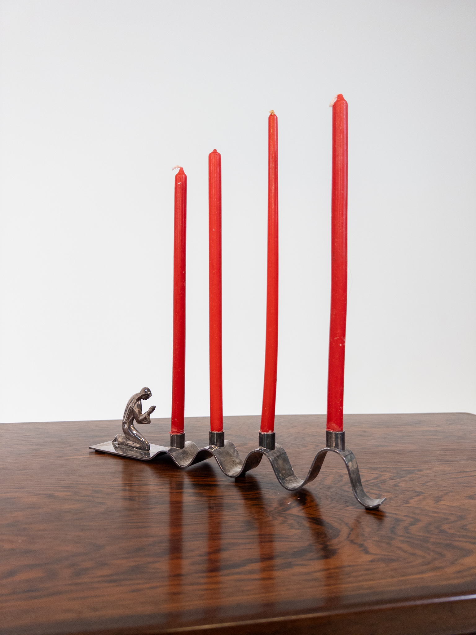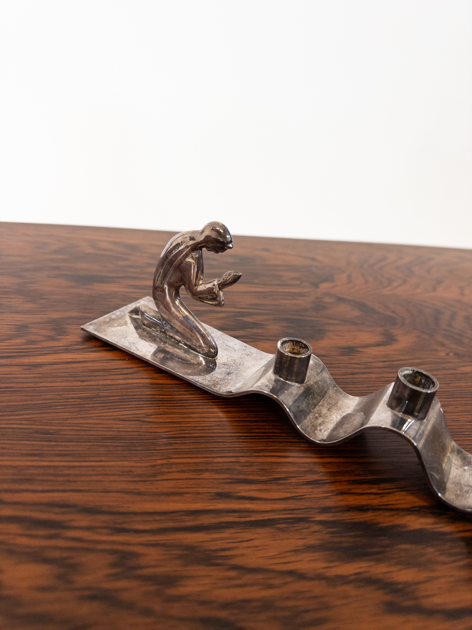 Den vågformade basen tillsammans med den stiliserade, knäböjande figuren ger ett tydligt Art Deco-uttryck. Ljushållarna är gjorda för smala ljus, och modellen är ovanlig att hitta.
